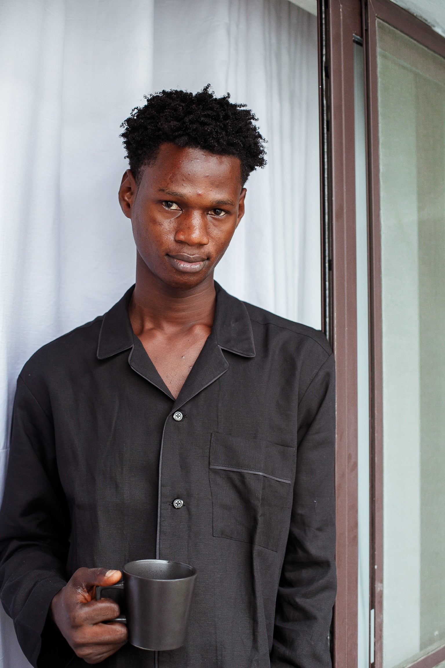 The silhouette is relaxed yet intentional, moving effortlessly between sleepwear and elevated loungewear. Cut with clean lines and a tailored drape, the set offers a composed presence at home whether greeting the morning with a warm cup or unwinding at day’s end.