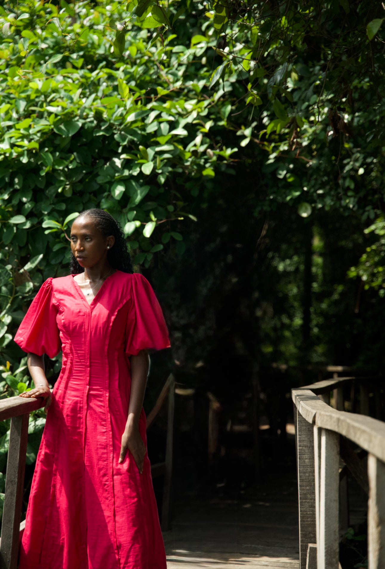 A cinched waist with quiet precision, voluminous puff sleeves that command attention, and a triple-lined skirt that moves with strength and softness. Hidden pockets nod to the woman who carries more than what the world sees strategy, grace, and unshakable vision.