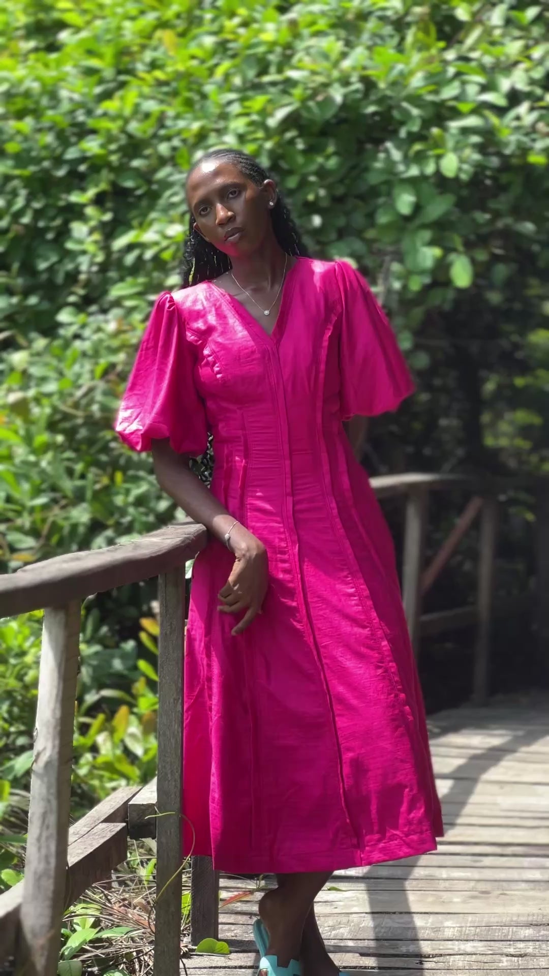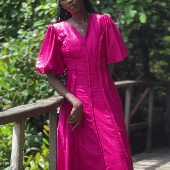 Linen Fuchsia Midi Puffer Sleeve Dress